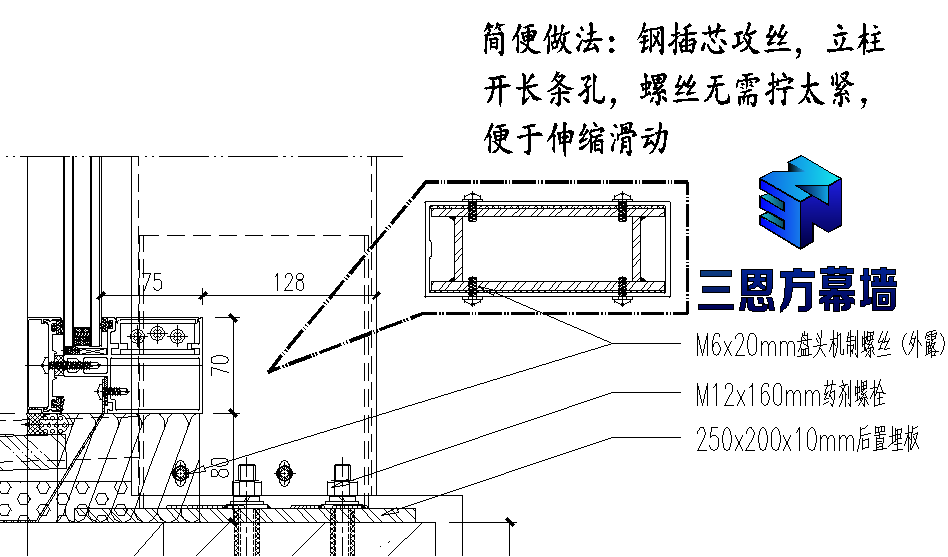 鋼立柱底部,只能鋼插芯,用6mm厚鋼板焊接工字型或矩形盒狀(3mm厚的也用過,磕碰后精度差),因鋼插芯沒有鋁立柱和鋁插芯配合那么緊密,為防止有余量晃動(dòng)或噪音,給用戶體驗(yàn)不穩(wěn)定感,立柱開長條孔,插芯攻絲外擰機(jī)制不銹鋼螺絲(還有不規(guī)矩的做法:鋼插芯不打孔攻絲,直接擰盤頭自鉆釘),下圖是鋁立柱底座沒用鋁插芯,為節(jié)省鋁材,采用的是鋼插芯,示意一下就清楚了: